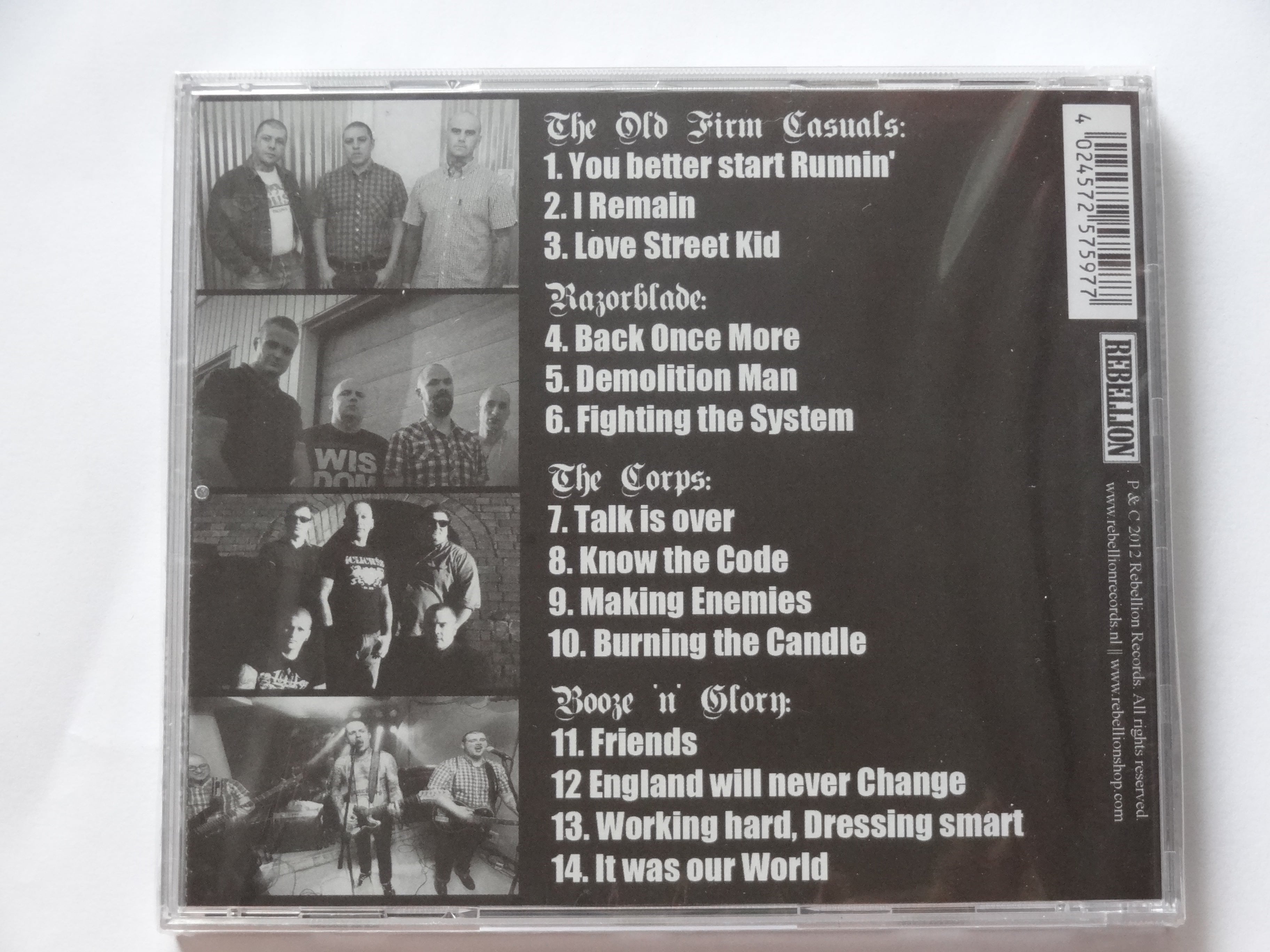 RancidのLarsが在籍するTHE OLD FIRM CASUALS、オランダを代表するOi!/SKINHEADバンド・RAZORBLADE、エッジの効いたロックンロール・サウンドが特徴的な、オーストラリアはシドニー出身のTHE CORPS、キャッチー&シンガロングなサウンドのUK Oi!バンド・BOOZE & GLORYによる4WAYスプリットCDです。全14曲収録。REBELLION RECORDSよりリリース。