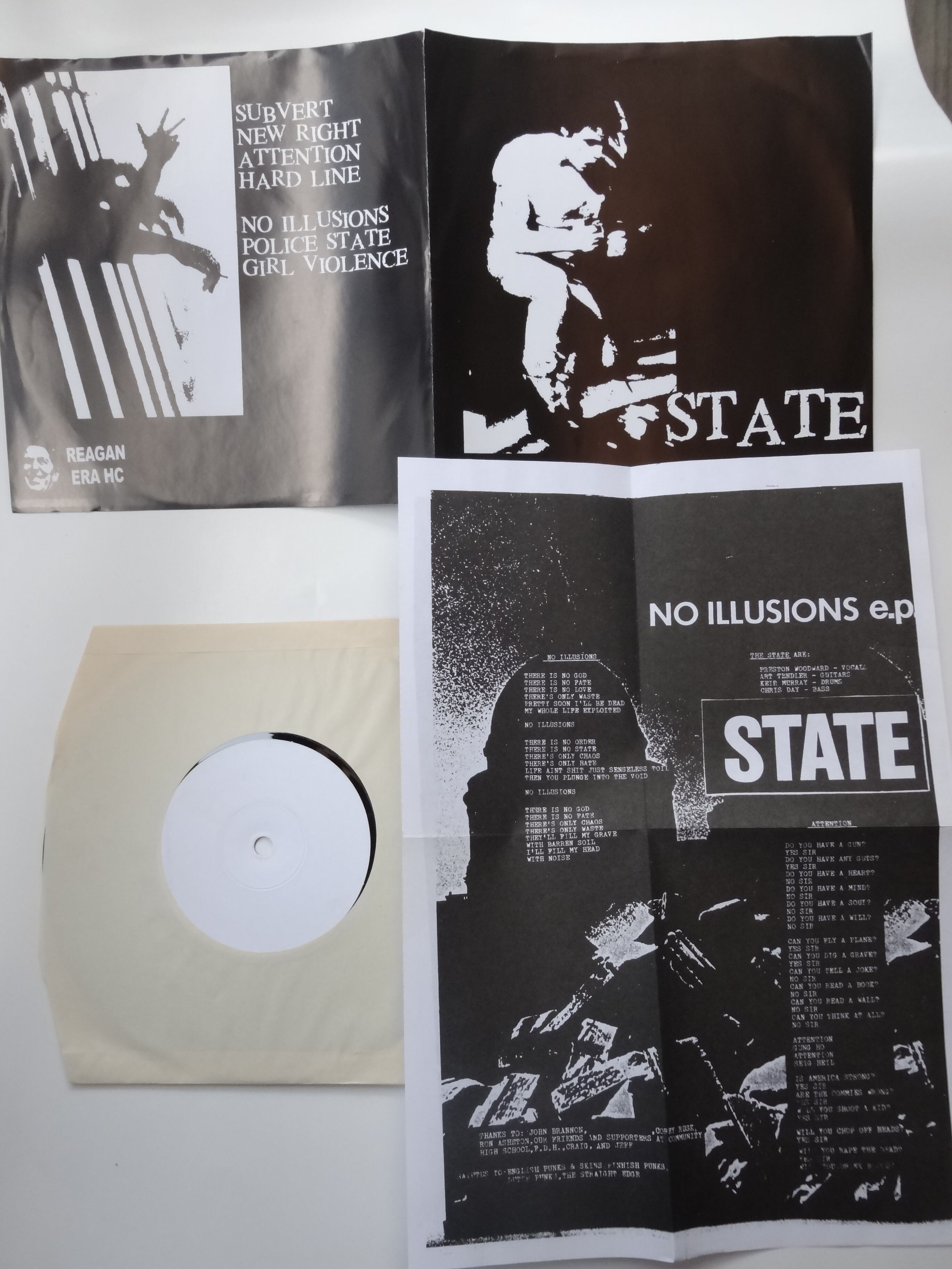 USAはミシガン州のハードコアバンド・STATEの、1983年にリリースされた激レアだった7インチの、2001年リリースのUnofficialアナログ盤。「Reagan Era HC」からのリリース、とある。インナー入り。