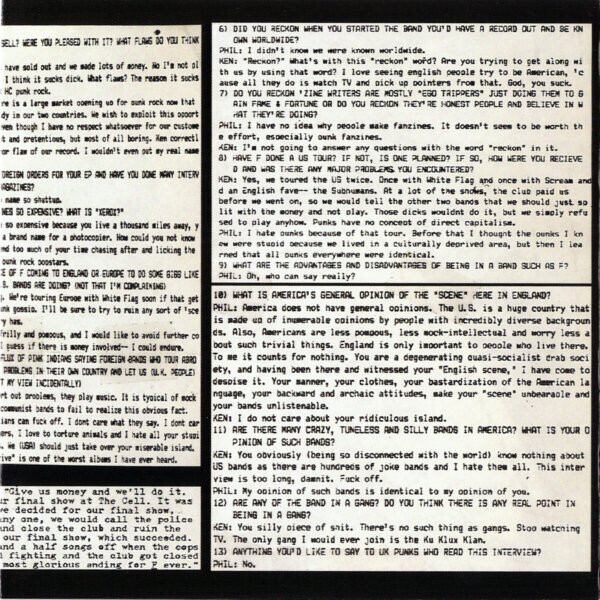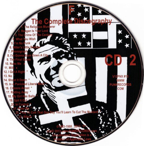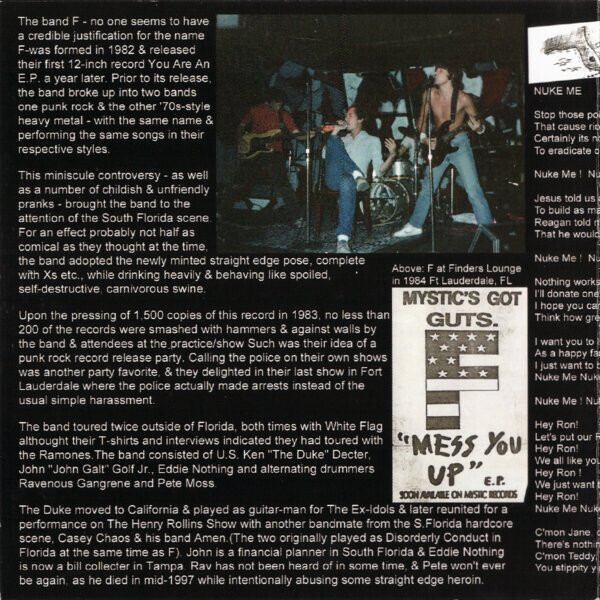 1986年リリースのWhite FlagとのカップリングLPで知られる、USAはフロリダの80'Sハードコア「F」の、80年代にリリースされた全公式音源に加え、ライブ、デモ、スタジオ音源も収録した全44曲入りの2枚組CD。