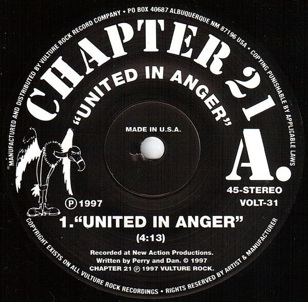 悪名高きUSAのVulture Rock Recordsから1997年にリリースされた、イリノイ州のOi!バンド・CHAPTER 21の7インチシングルです!